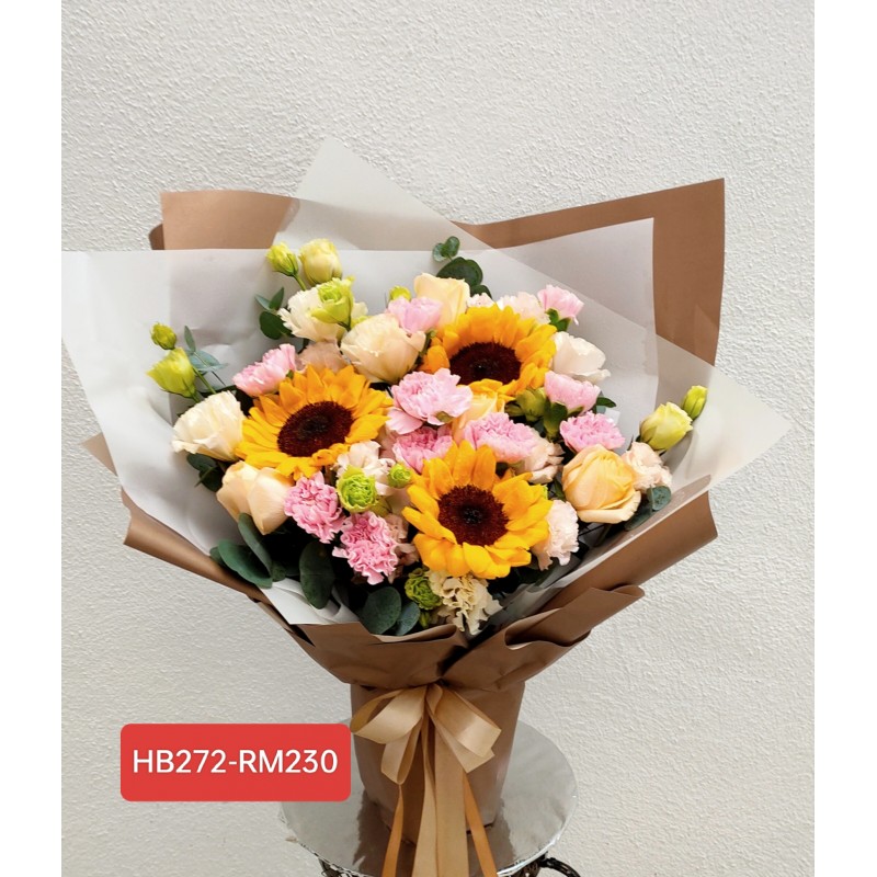 Bouquet with 3 sun flowers, 6 champagne roses, 10 pink carnation, champagne eustoma.