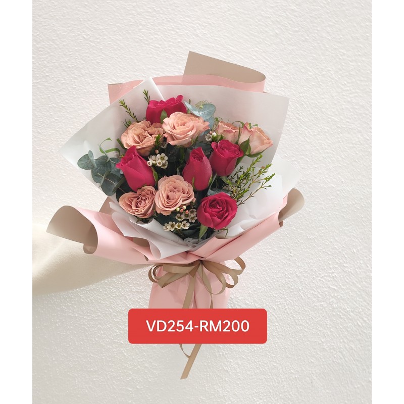 A bouquet with 5 red roses, 5 Cappuccino roses and baby's breath.