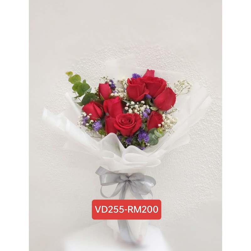 10 red roses with baby's breath, statice and eucalyptus.
